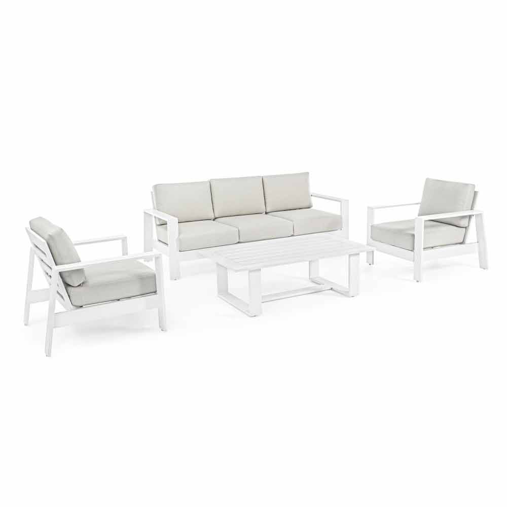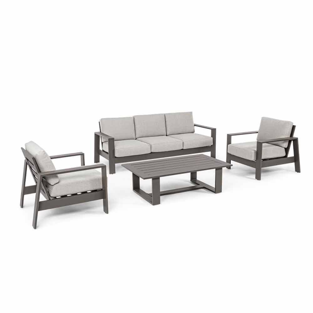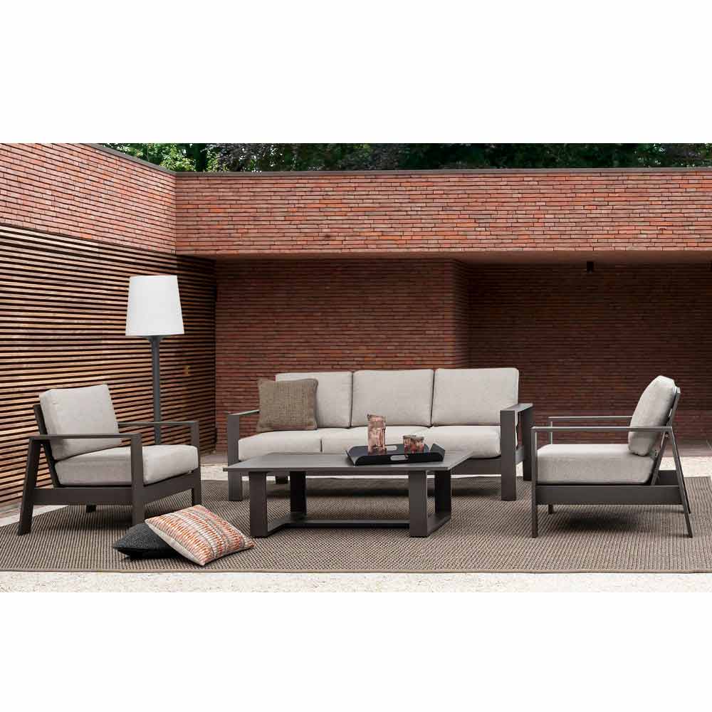 Sala de estar ao ar livre com sofá, poltronas e mesa de centro de alumínio.