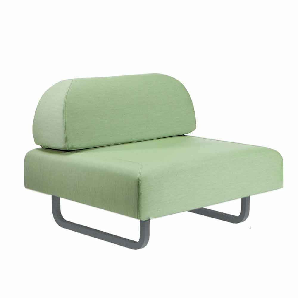 Composição para sala de estar ao ar livre, caracterizada por um design entre o retrô e o futurista, composta por um sofá de dois lugares, um sofá de três lugares e uma poltrona. Cada um desses produtos possui estrutura interna de madeira resistente e estofamento selado com tecido acrílico 100% tingido para uso externo,