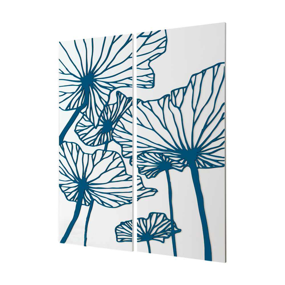 Composição de dois painéis em madeira lacada a branco mate com aplicação de decorações em madeira de cor petróleo representando flores gigantes.