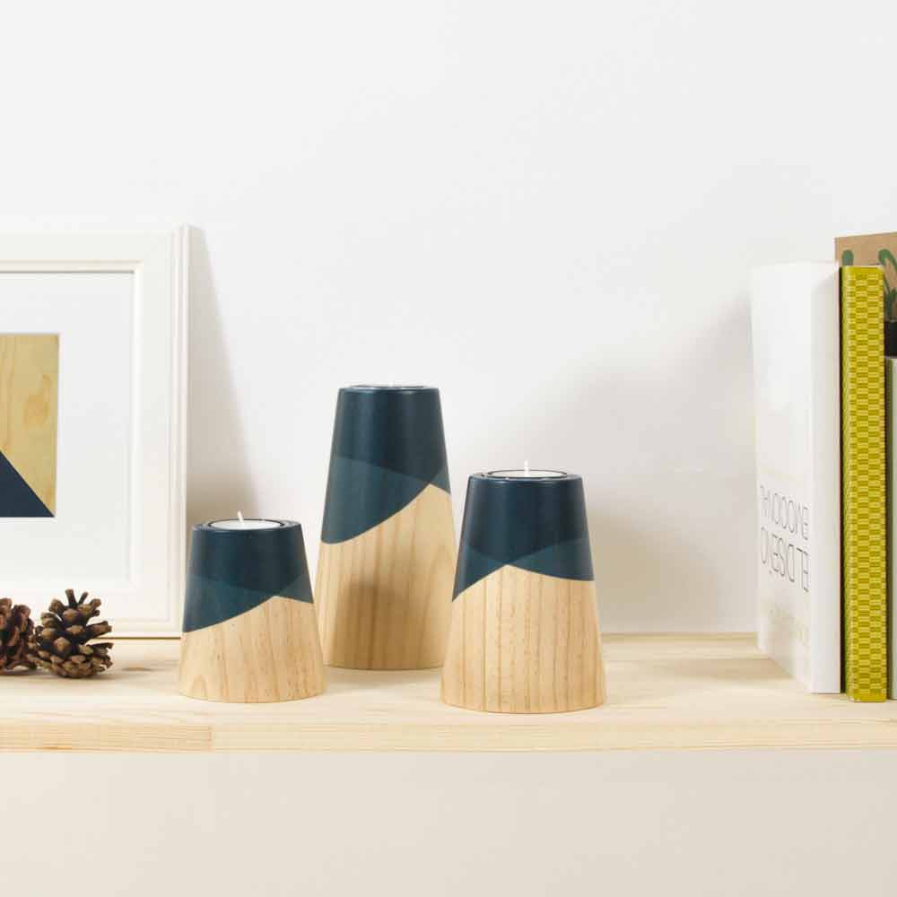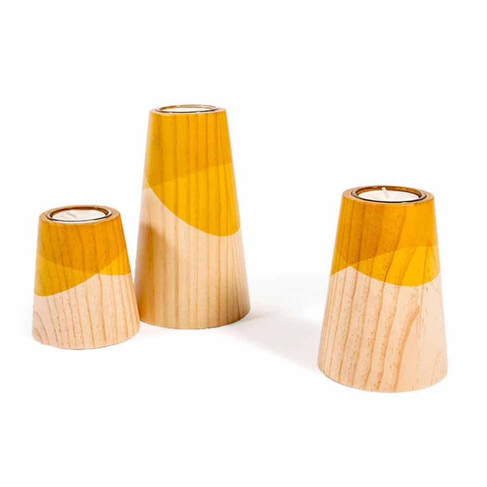 Composição de castiçais em pinho maciço com detalhe manchado, 3 peças.