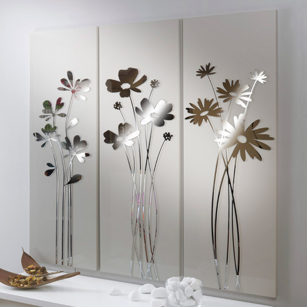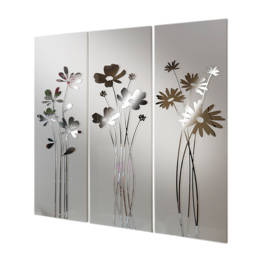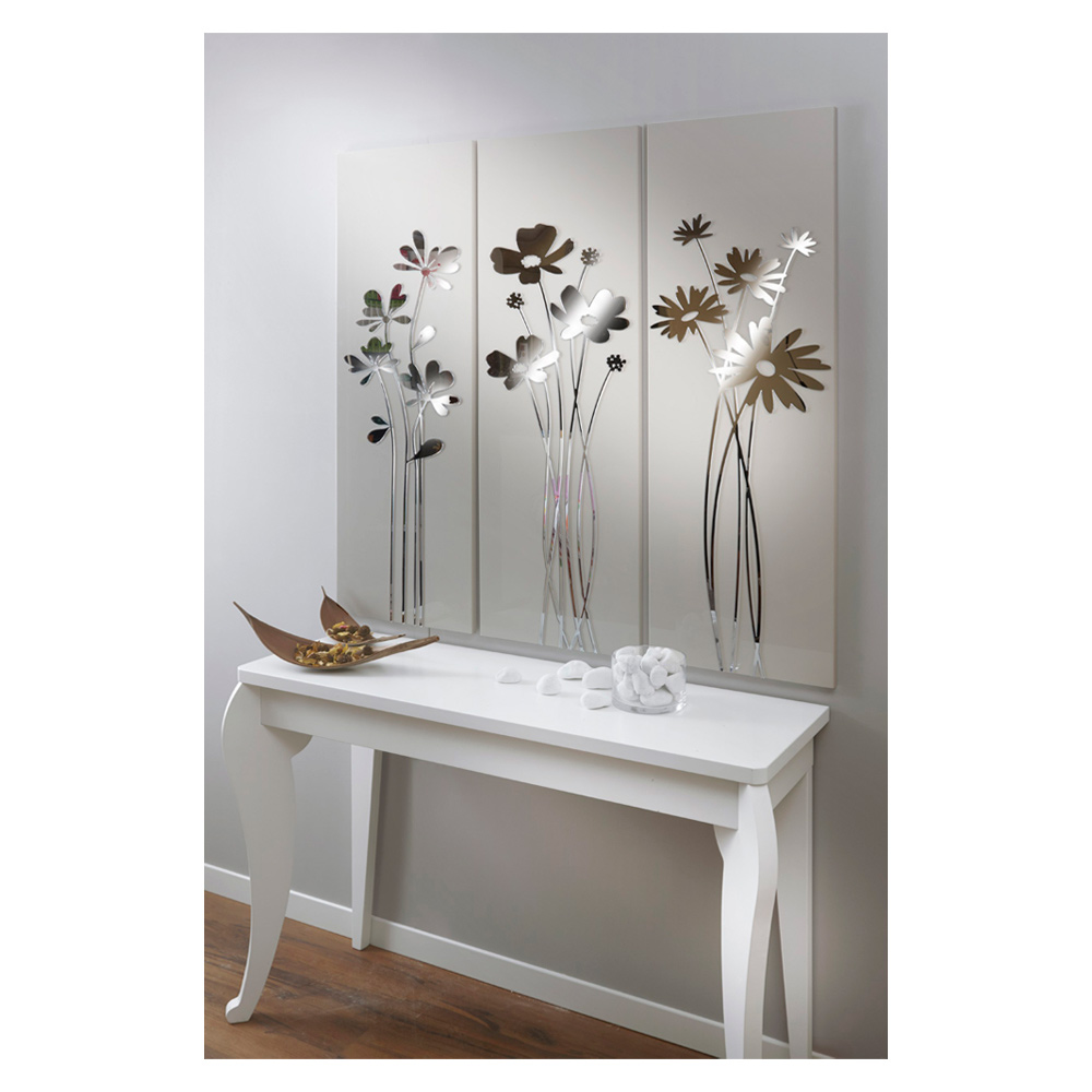 Composição de 3 painéis para pendurar individualmente em madeira lacada areia brilhante com aplicação em plexiglass espelhado representando bouquets de flores.