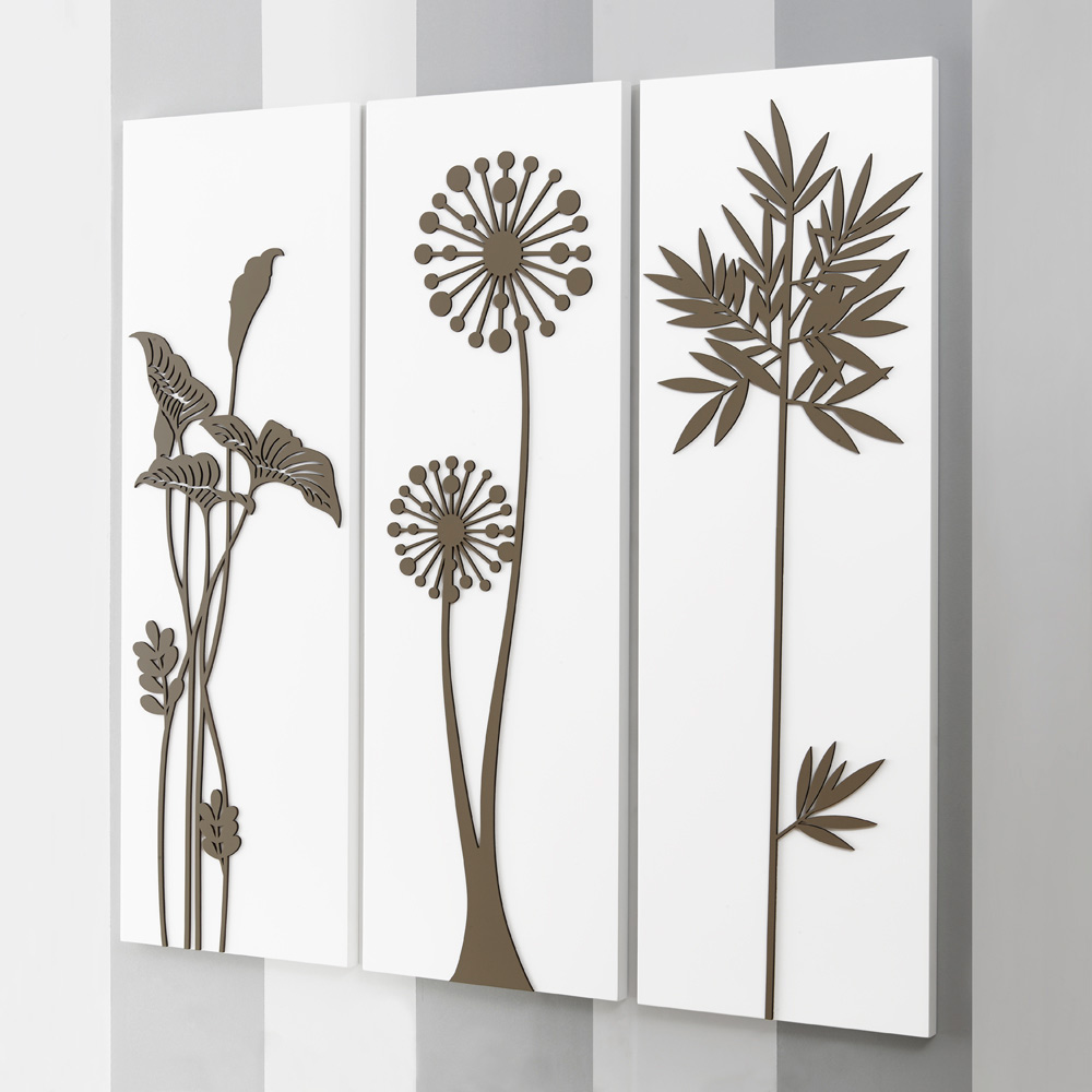 A composição dos painéis é feita com a técnica de marcação a laser que cria um baixo-relevo no material, criando diferentes gradações de cores criadas no painel. O painel é de madeira lacada a branco com decoração em cinzento pomba . Representa flores e folhas estilizadas, que formam um trio essencial de painéis.