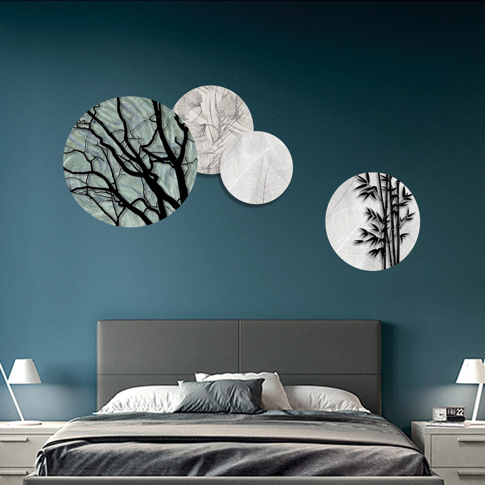 Composição de quatro painéis de diferentes tamanhos que combinam decorações a laser e impressão . Composto por quatro painéis circulares em madeira estampada : um retrata ramos pretos sobre fundo verde/azul/cinzento, um de folhas em tons de castanho e fundo areia, um com folhas brancas e fundo cinzento e outro com folhas brancas e ramos pretos.