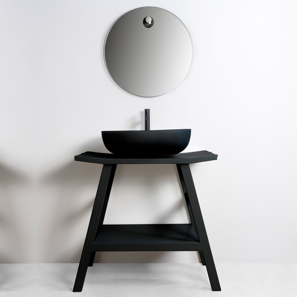 Composição de móveis de banheiro com pia em resina preta e espelho redondo.