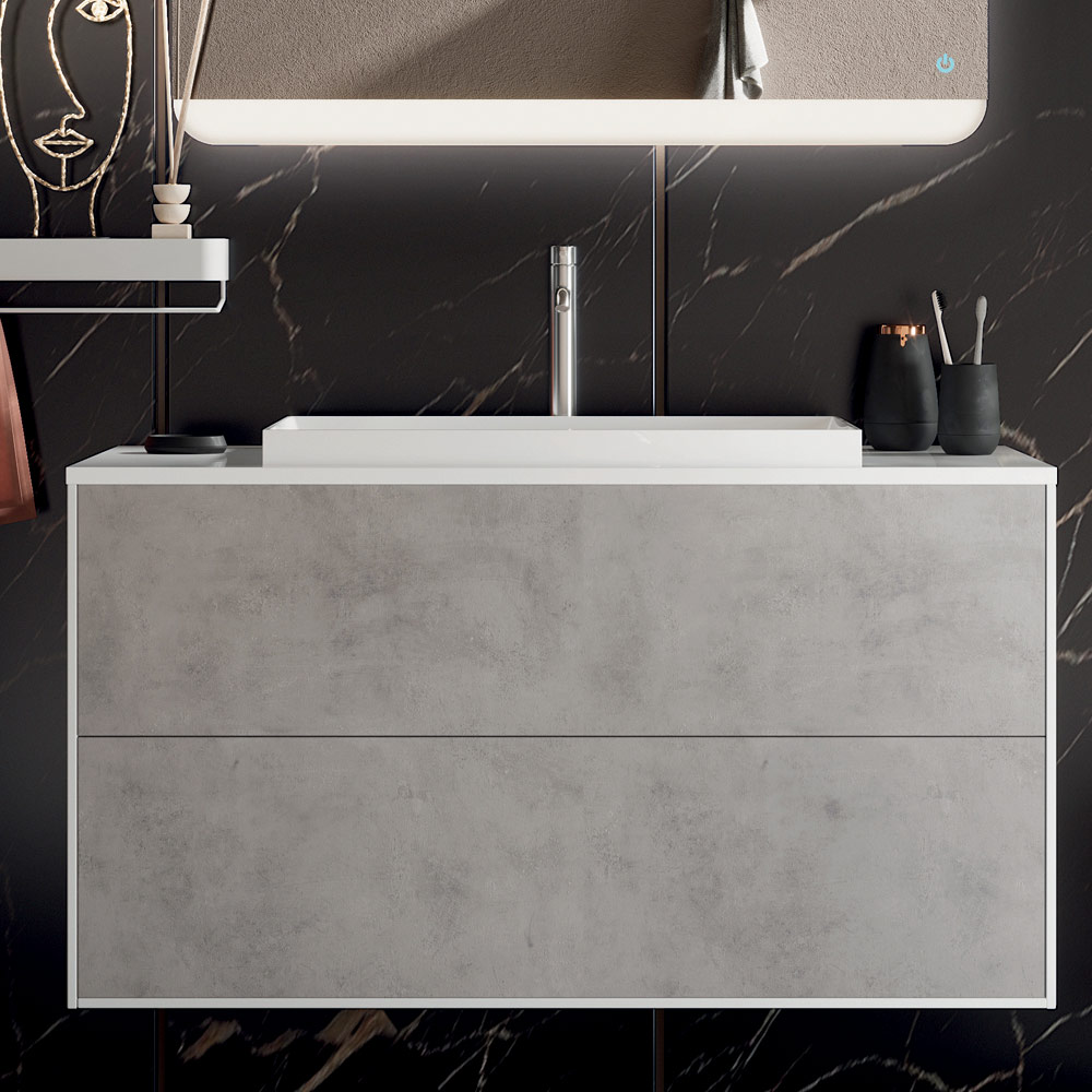 Composição de casa de banho completa com lavatório embutido em resina , espelho de vidro com LEDs frontais e perimetrais e base em melamina resistente a riscos na cor cimento com 2 gavetas totalmente extraíveis e fecho soft close.