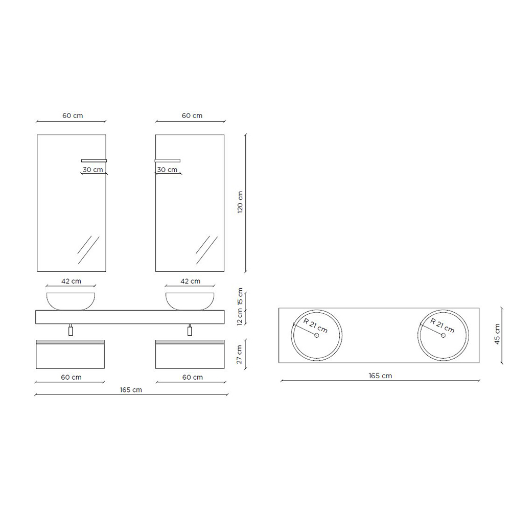 Composição de casa de banho composta por: 2 lavatórios em resina branca mate assentes sobre tampo em carvalho cor mel, 2 bases em melamina branca brilhante resistente a riscos e 2 espelhos com lâmpada LED.