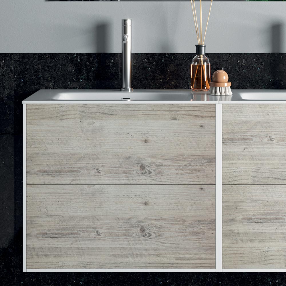 Composição do banheiro completo com pia dupla de cerâmica , espelho retangular com luz LED frontal única e fundo em melamina resistente a riscos na cor pinho ártico com 4 gavetas com abertura total e fecho soft close.