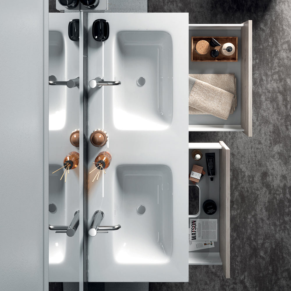 Composição do banheiro completa com espelho, pia dupla em cerâmica e base Made in Italy.