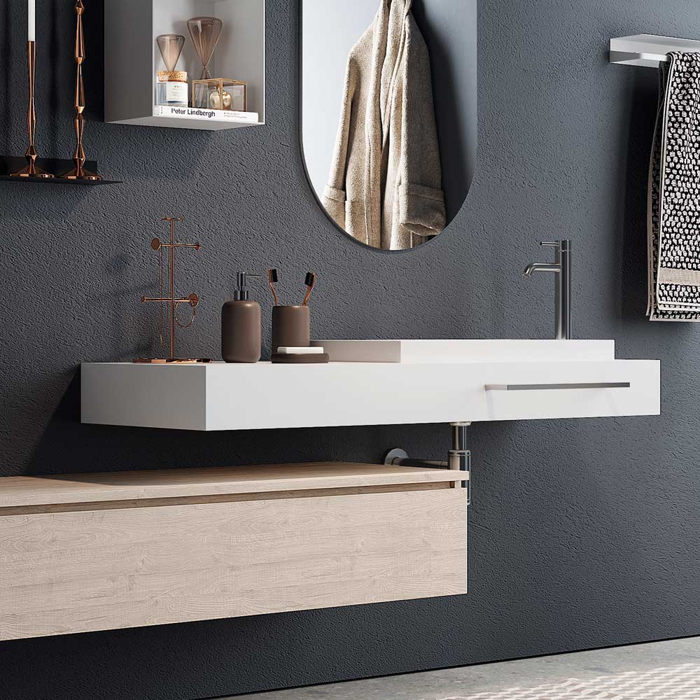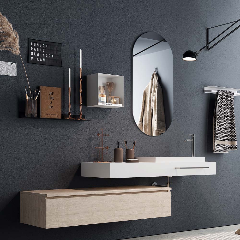 Composição de banheiro made in Italy composta por espelho de vidro oval , base em melamina natural resistente a riscos de cor carvalho com gaveta metálica totalmente extraível e fecho soft close . tampo em mdf revestido e hpl branco brilhante sobre o qual assenta um lavatório em resina branca.