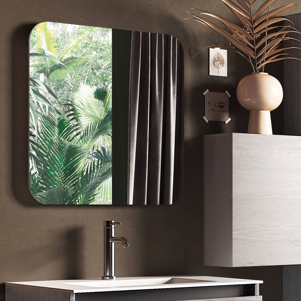 Composição de banheiro com espelho quadrado com cantos arredondados, base em carvalho freixo resistente a riscos com gaveta totalmente extraível e fecho soft close e pia embutida em resina branca brilhante Fabricado na Itália.