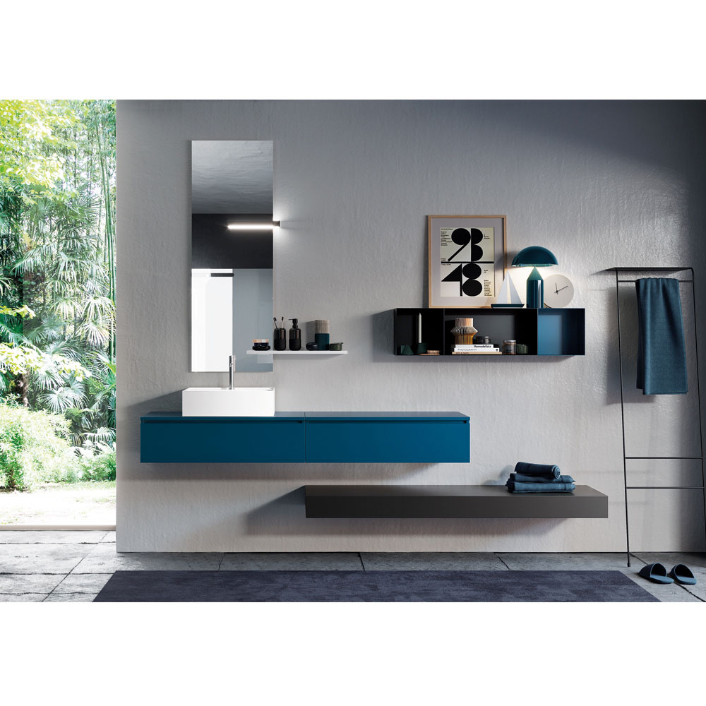 Também estão incluídos os 4 cubos suspensos em metal lacado azul brilhante/azul claro e preto e a prateleira moldada em frente ao espelho em MDF branco brilhante.
