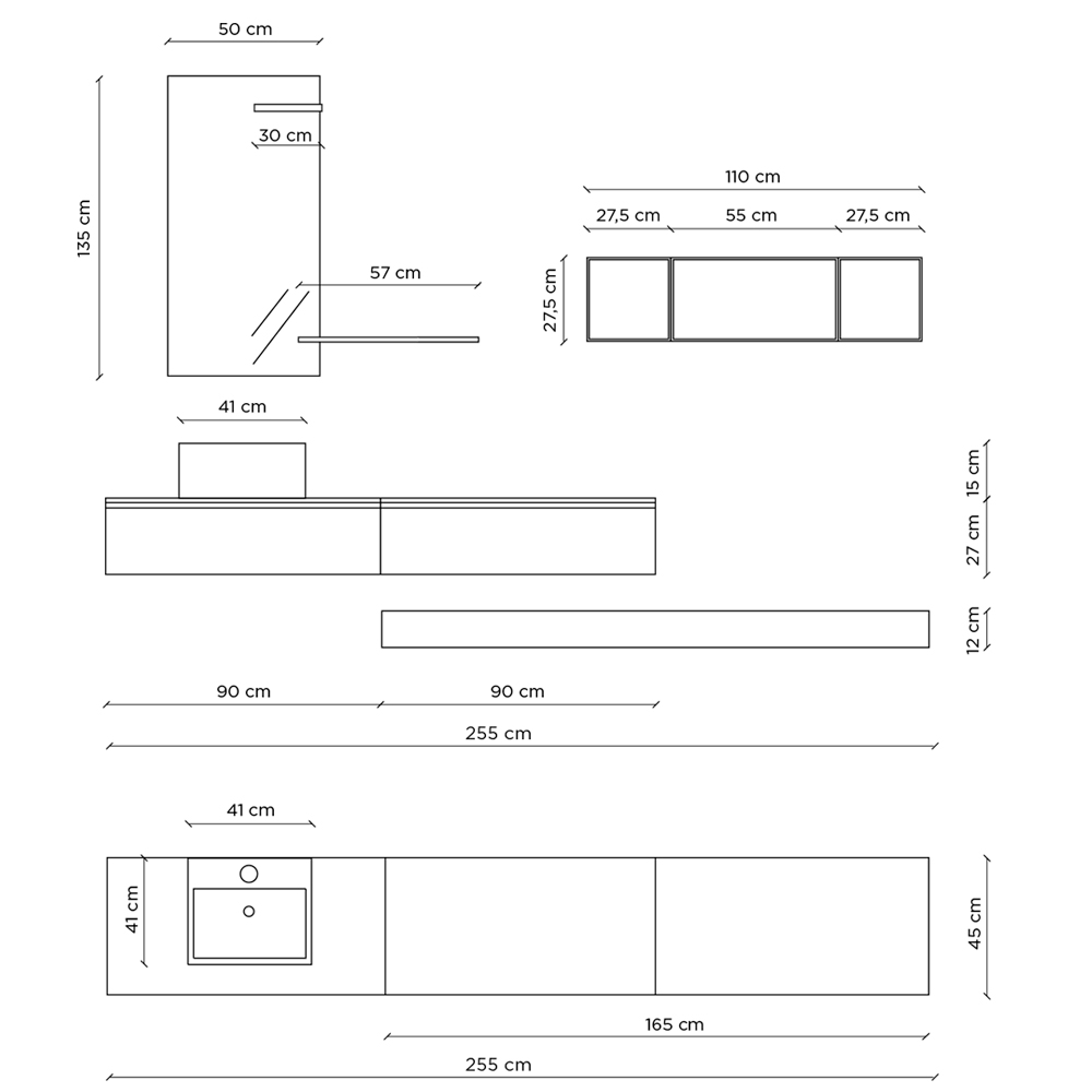 Parte superior: C 180 cm x A 27 cm x P 45 cm