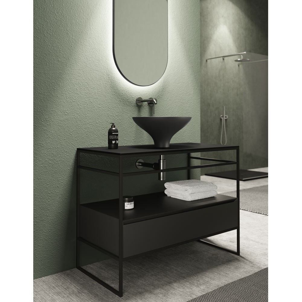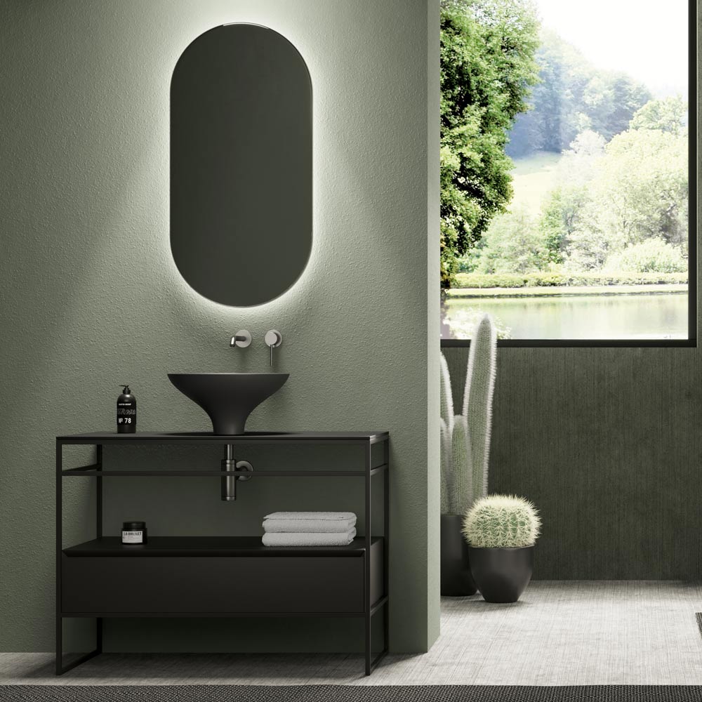 Composição de banheiro inteiramente feita na Itália composta por pia, base e espelho. O lavatório é feito de cerâmica com acabamento em preto fosco com suas curvas harmônicas em diálogo entre estética e elegância e foi projetado para ambientes modernos e sofisticados. A base possui estrutura em aço inox preto fosco com tampo em cerâmica e gaveta em madeira com corte a 45° e fechamento lento. A composição é completada pelo espelho de parede oval retroiluminado com moldura de alumínio com acabamento em preto fosco .