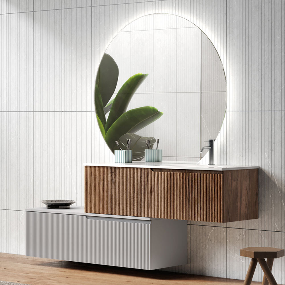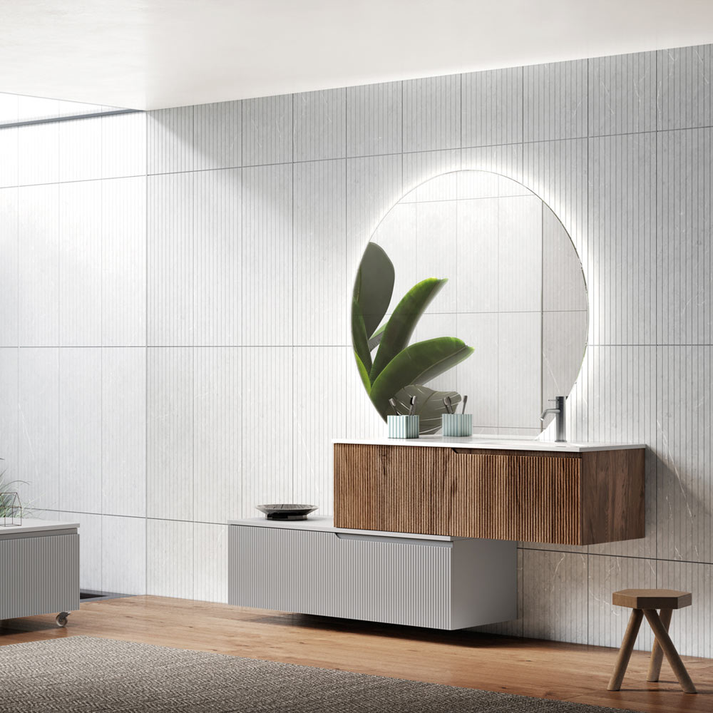 Composição de banheiro em MDF cinza e carvalho Rio canelado Fabricado na Itália