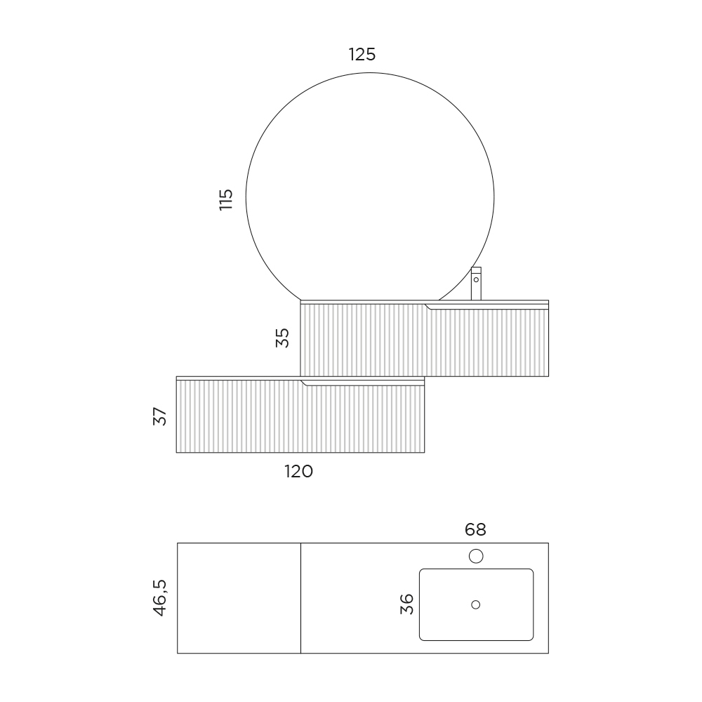 - Lavatório: Comprimento 121 x Profundidade 46,5 x Altura 1,6 cm - Comprimento da tigela 53 cm