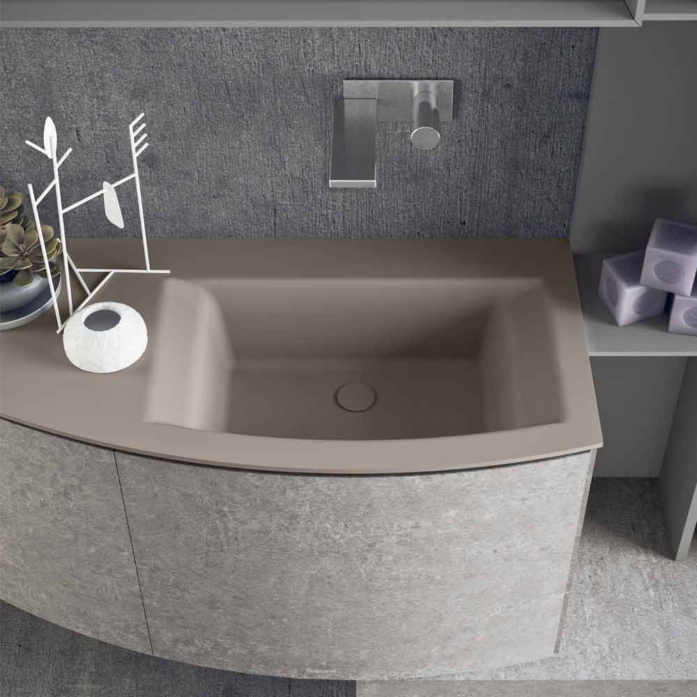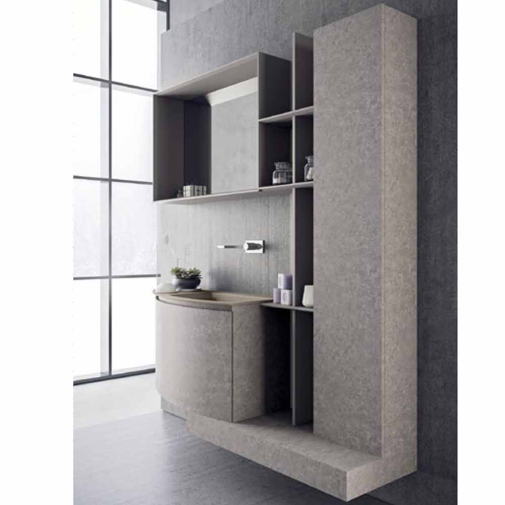 Conjunto de móveis de banheiro com frentes curvas em unicolor portland HPL , coluna suspensa em unicolor portland HPL H 162 cm, lavatório integrado em cinza fosco pomba Teknorit , elemento aberto em laca mouse mate, banco grosso H 10 cm.
