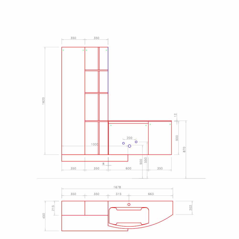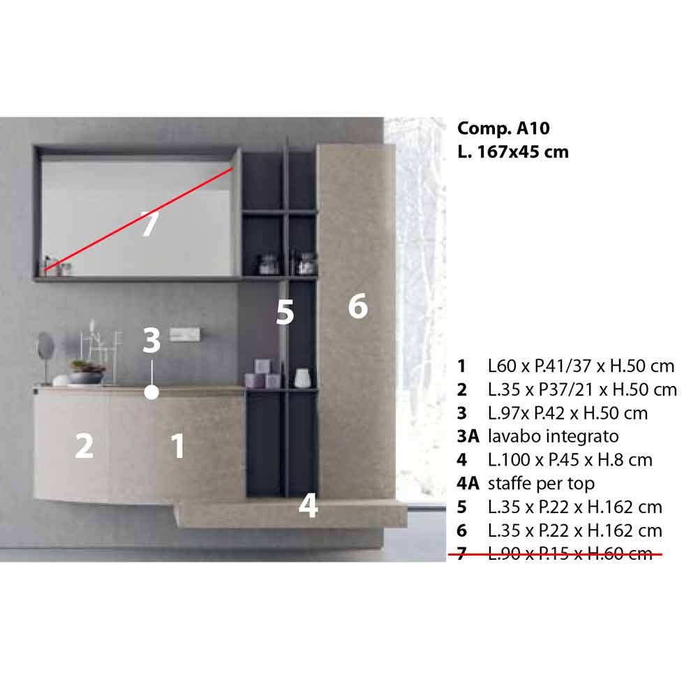 Esta clareza formal é dada pela porta ranhurada com perfil inclinado. A peculiaridade desta composição é dada pelo lavatório embutido caracterizado por duas faces laterais que descem suavemente em direção ao lavatório e pelo móvel curvo de parede que o contém.