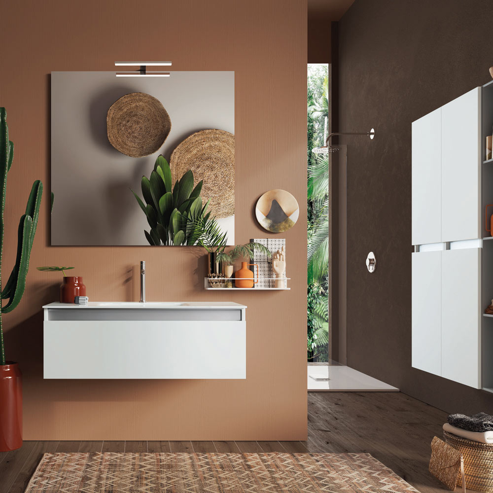 Composição de banheiro com pia em resina branca brilhante, espelho reversível com moldura retrátil em ABS com luminária, base suspensa em melamina branca brilhante resistente a riscos com gaveta totalmente extraível e fecho soft close.
