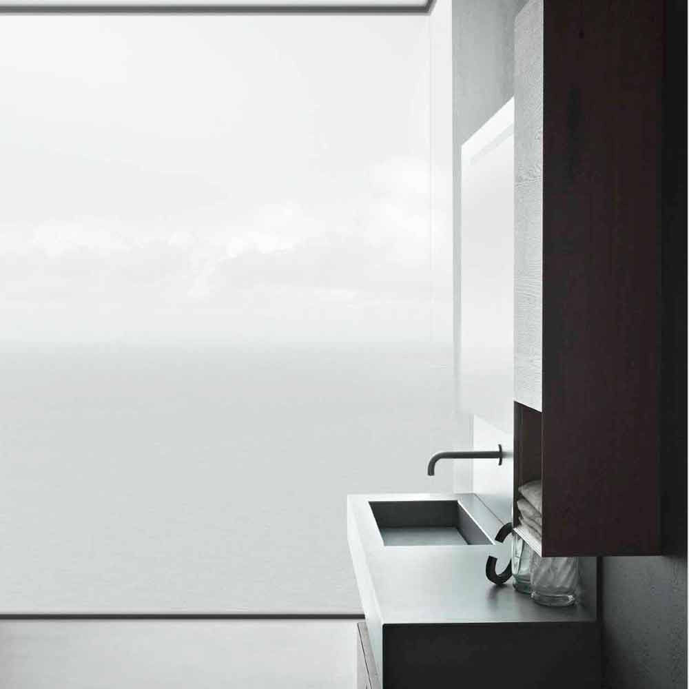 A peculiaridade desta composição consiste nos contrastes de materiais: as cores do concreto que compõem as portas e tampos dos lavatórios combinam perfeitamente com as superfícies quentes da madeira de carvalho trabalhada com tratamentos exclusivos ou com a materialidade dos novos materiais inovadores como o laminam .