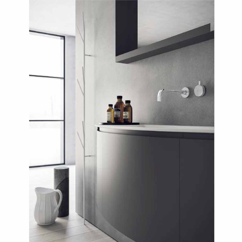 A peculiaridade desta composição é dada pelo lavatório embutido caracterizado por duas faces laterais que descem suavemente em direção à bacia.