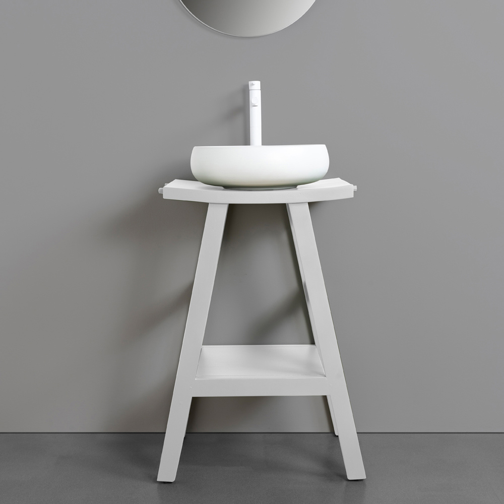 Composição de banheiro com armário de piso de teca, pia de barro e acessórios.