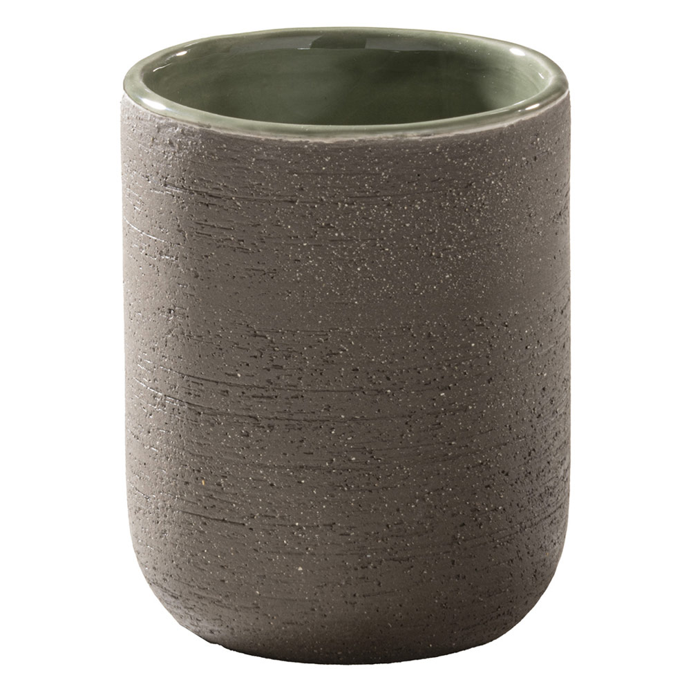 Composição de banheiro com pia de barro, acessórios de bancada e espelho.