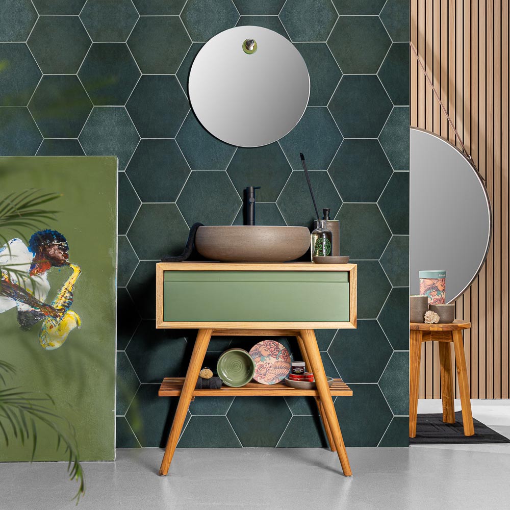 teca recuperada natural completo com gaveta com aba em madeira de mogno pintada de verde e