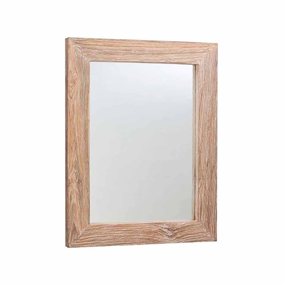 Espelho de 4 mm montado em perfil cassete de 8 cm de largura por 4 de espessura, em Teca maciça. O tratamento branqueado destaca os desenhos da madeira natural e permite perceber a natureza do material ao toque.
