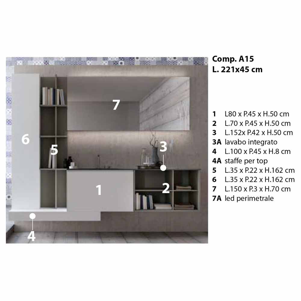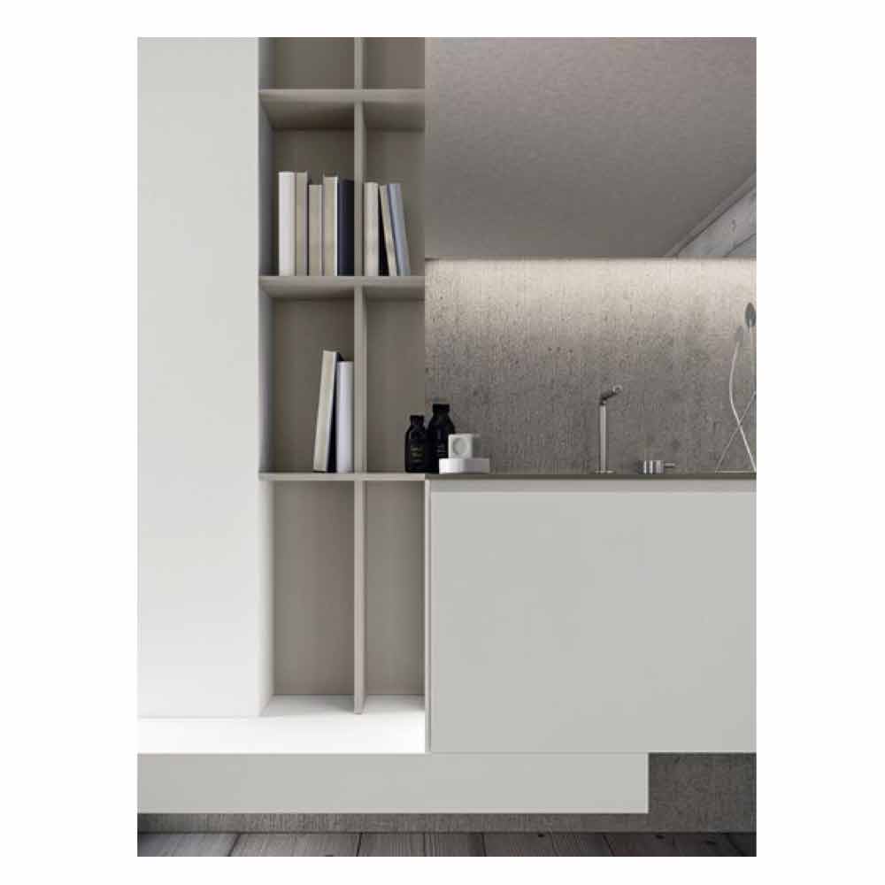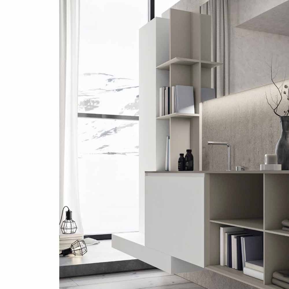 Composição de banheiro suspenso moderno, design regular com prateleiras abertas, made in Italy.