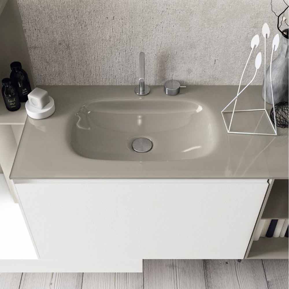 A cena é finalizada pelo lavabo embutido com bordas suaves na prateleira de vidro.
