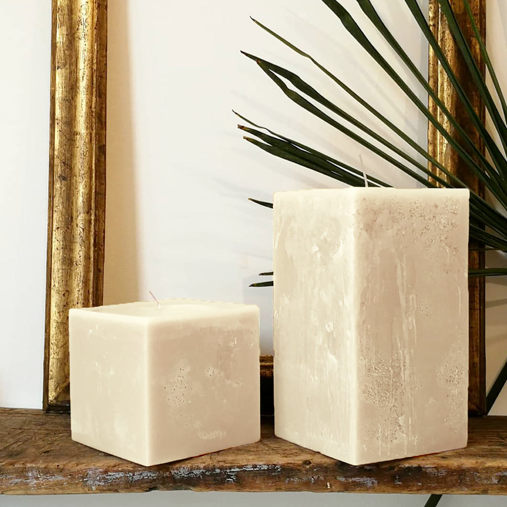 Composição de 3 velas quadradas de diferentes tamanhos e disponíveis em diferentes cores feitas de cera Made in Italy.