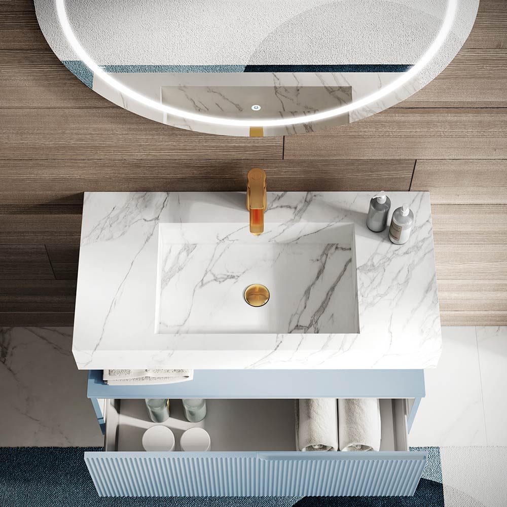 Composição de banheiro em Calacatta HPL e MDF canelado azul Tiffany Fabricado na Itália