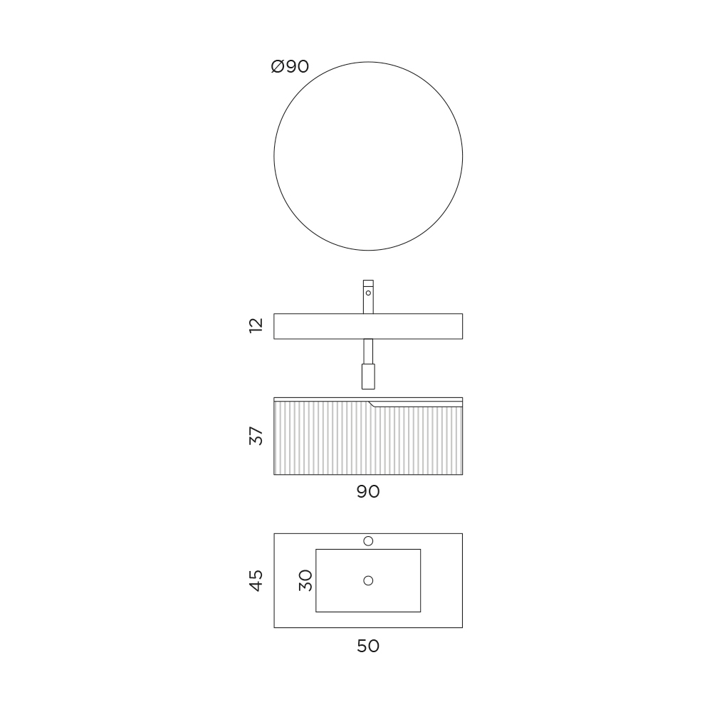- Tampo com bacia: Comprimento 90 cm x Profundidade 45 cm x Altura 12 cm