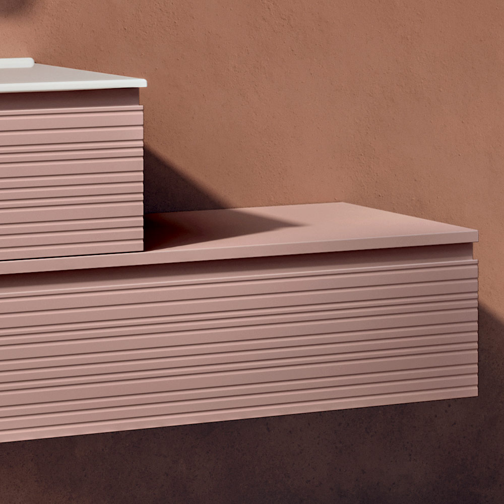 O tampo coordenado realça a composição com uma estética limpa e harmoniosa, criando uma continuidade visual que enfatiza o design minimalista do conjunto.