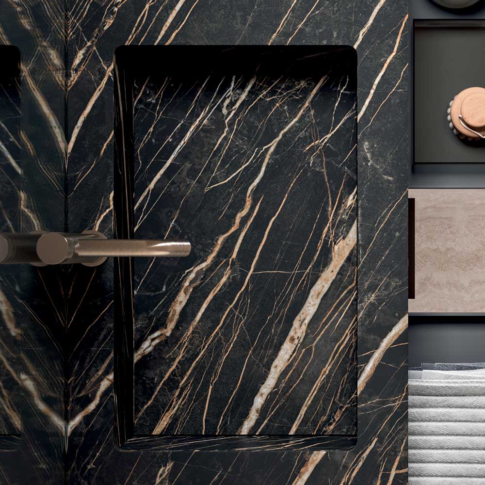 A cuba de apoio em grés, com acabamento em pedra escura, confere uma forte identidade ao material e garante alto desempenho em termos de resistência e durabilidade, tornando-a perfeita para o uso diário.
