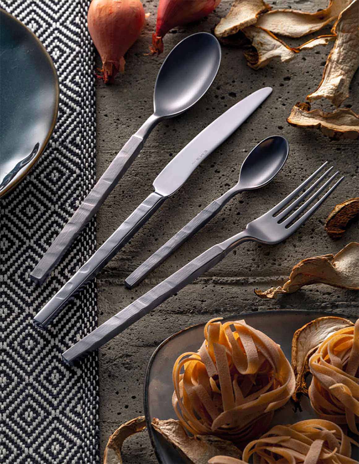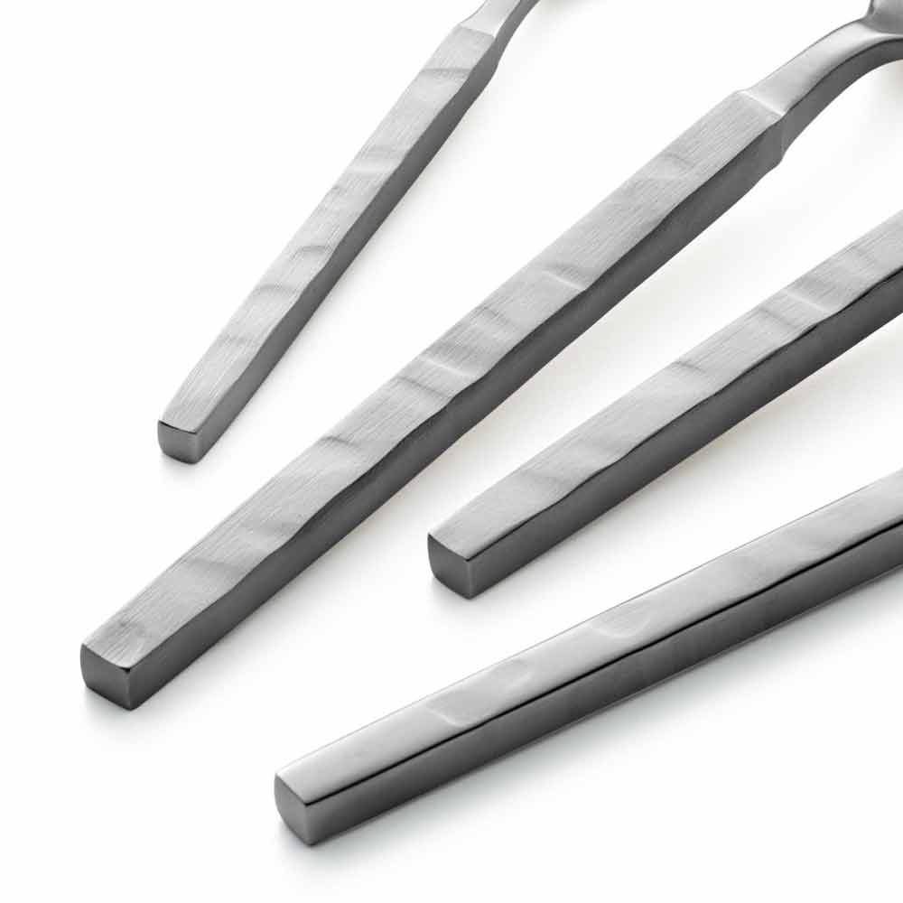 Em aço forjado, o design quadrado e a atenção funcional distinguem esta coleção de cutelaria inspirada nos modernos espaços urbanos. Os