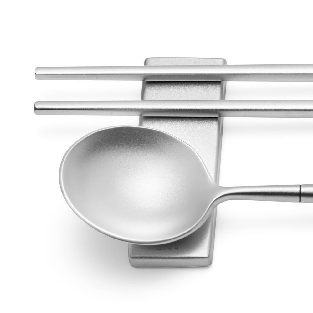 Os pauzinhos longos e finos são projetados para um uso confortável e uma pegada segura, enquanto a colher tem uma profundidade ideal para saborear caldos e molhos com facilidade. O diferencial é a base quadrada que serve de descanso para os talheres, garantindo que eles permaneçam sempre limpos e bem apresentados quando não estiverem em uso.