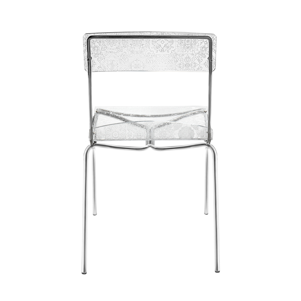 Habilmente confeccionada em plexiglass 100% polímero virgem , a cadeira possui uma concha transparente que celebra sua geometria única. Cada canto, cada linha, cada curva foi concebida para captar e reflectir a luz, mantendo o seu brilho impecável ano após ano.