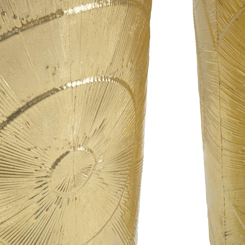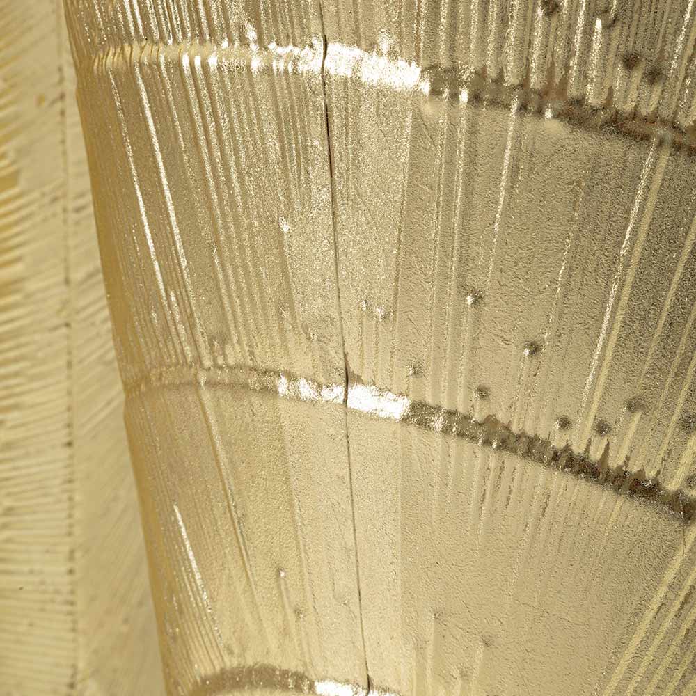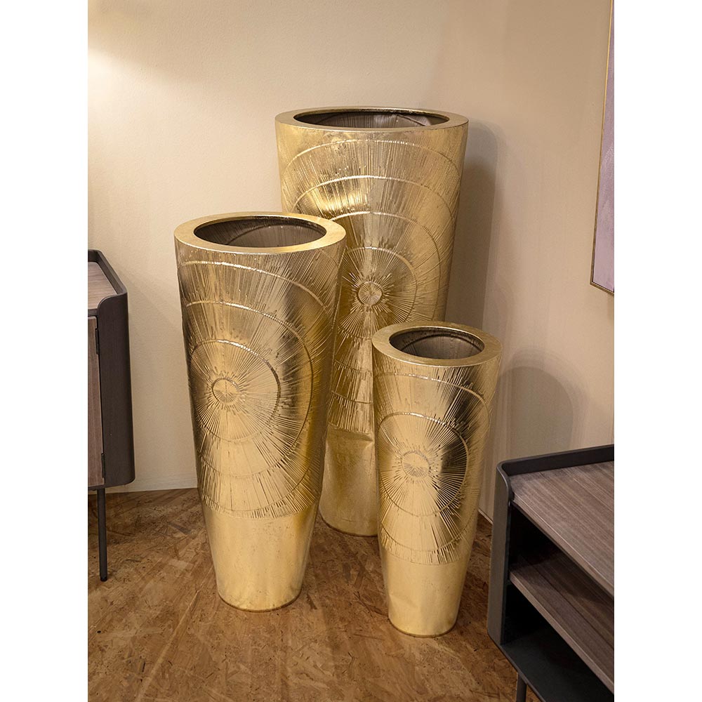 Estes vasos decorativos são verdadeiras esculturas, obras de arte que chamam a atenção e enriquecem qualquer ambiente com elegância . O seu tom dourado cria um efeito visual caloroso e acolhedor, enquanto as linhas gravadas no ferro criam um efeito radiante , que dá movimento e vida à superfície lisa dos vasos.
