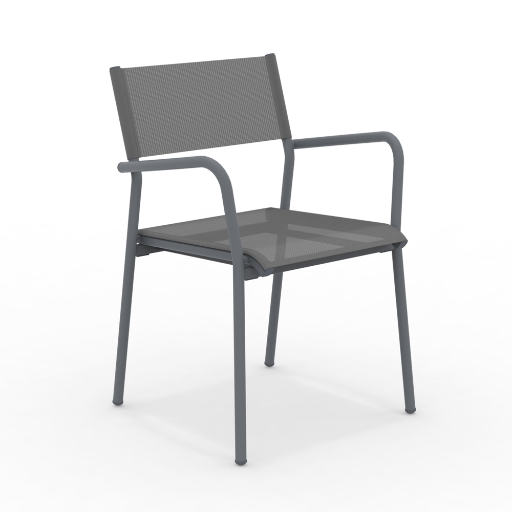 O assento e o encosto Batyline oferecem conforto ideal graças à sua respirabilidade e resistência aos agentes atmosféricos, garantindo um uso prolongado sem necessidade de manutenção. Os apoios de braços integrados adicionam um toque de conforto, tornando esta cadeira perfeita para longos momentos de relaxamento ao ar livre.
