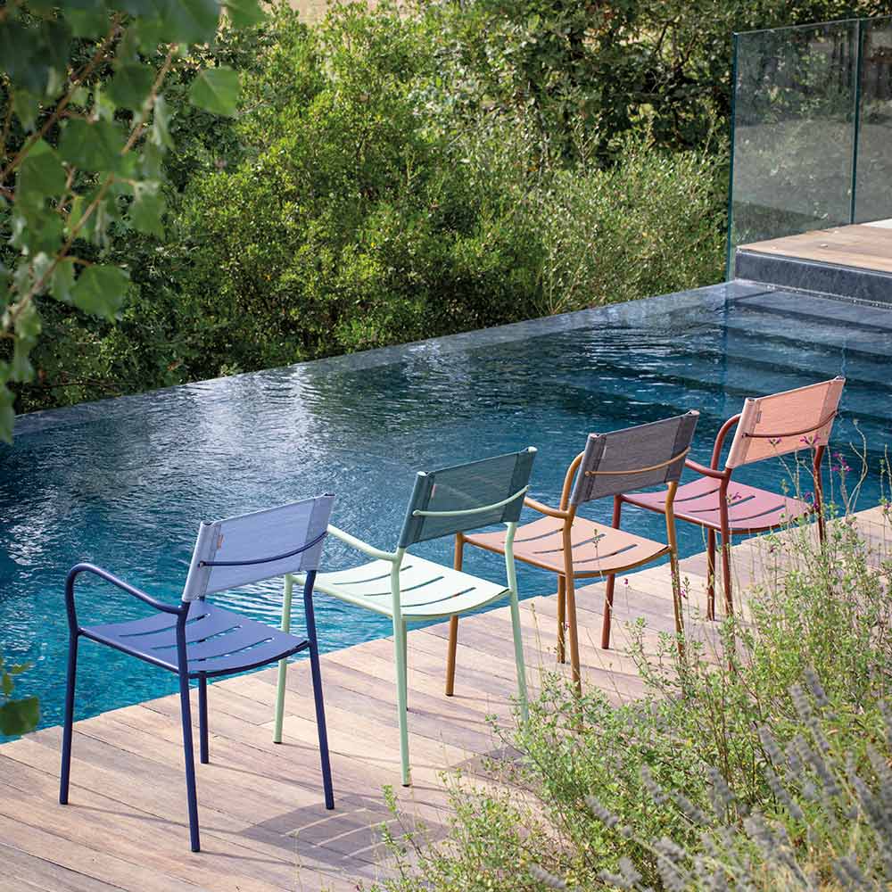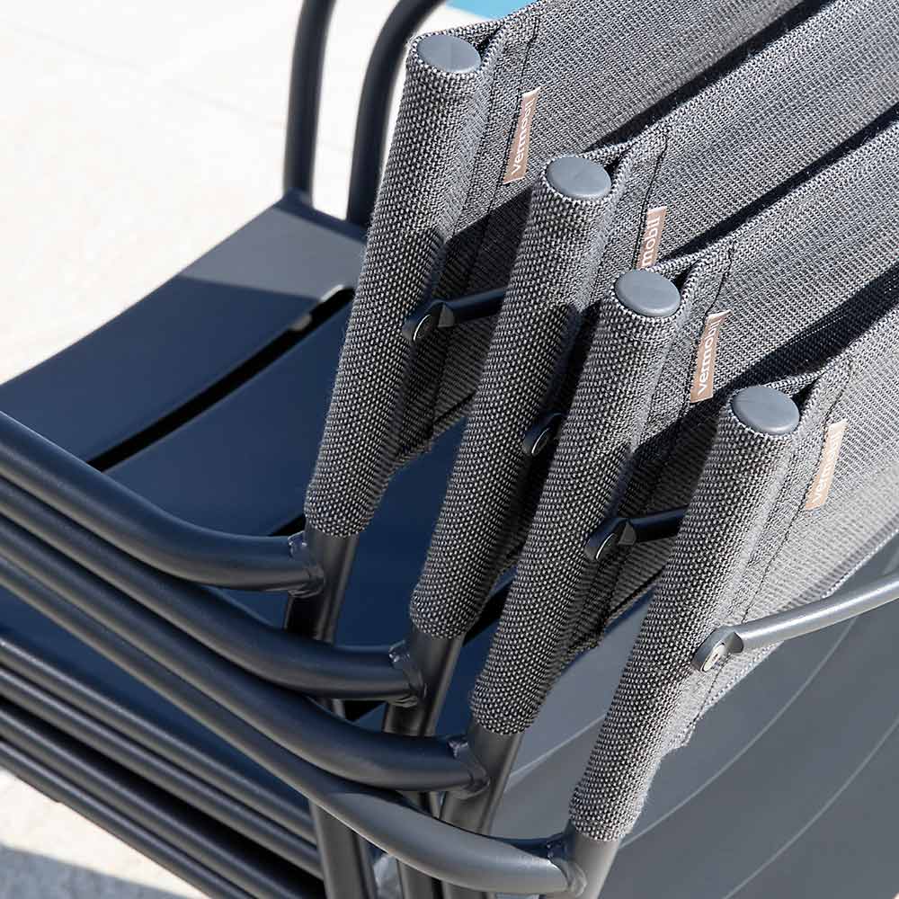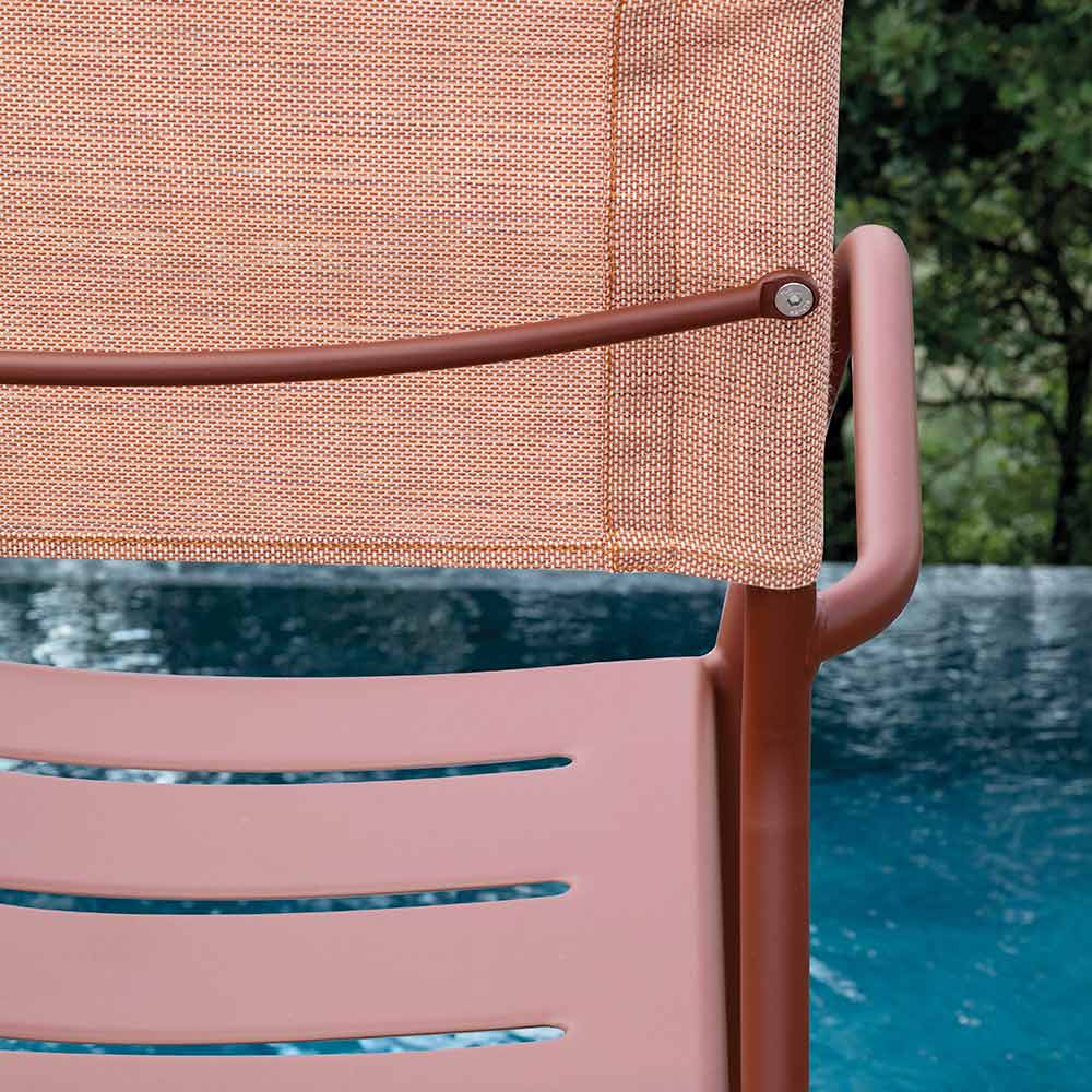 O assento ergonômico com linhas sinuosas garante excelente suporte e conforto, enquanto o encosto respirável em batyline oferece conforto superior, adaptando-se perfeitamente ao formato do corpo e promovendo a circulação de ar mesmo nos dias mais quentes. Os braços arredondados adicionam um toque de requinte, tornando a cadeira ainda mais confortável para momentos agradáveis de relaxamento ao ar livre.