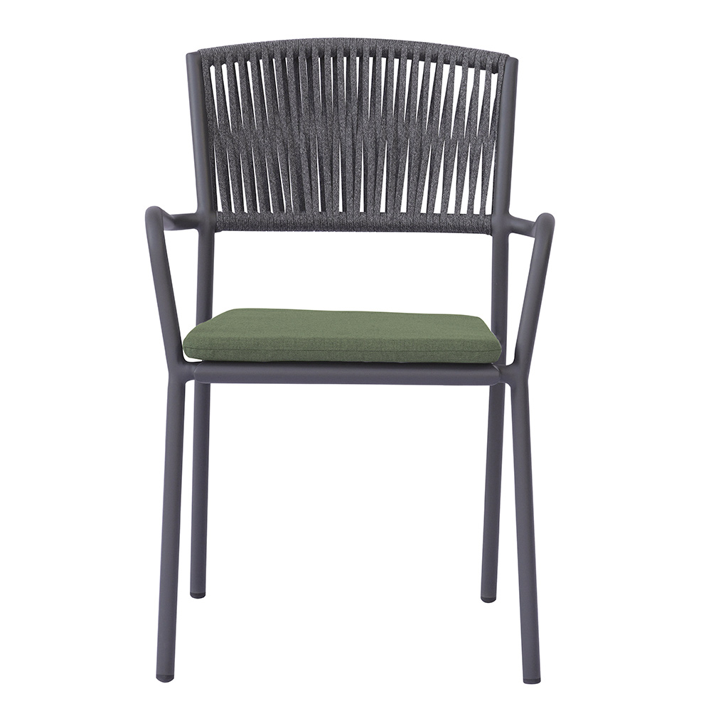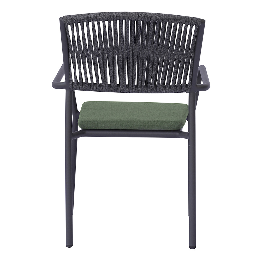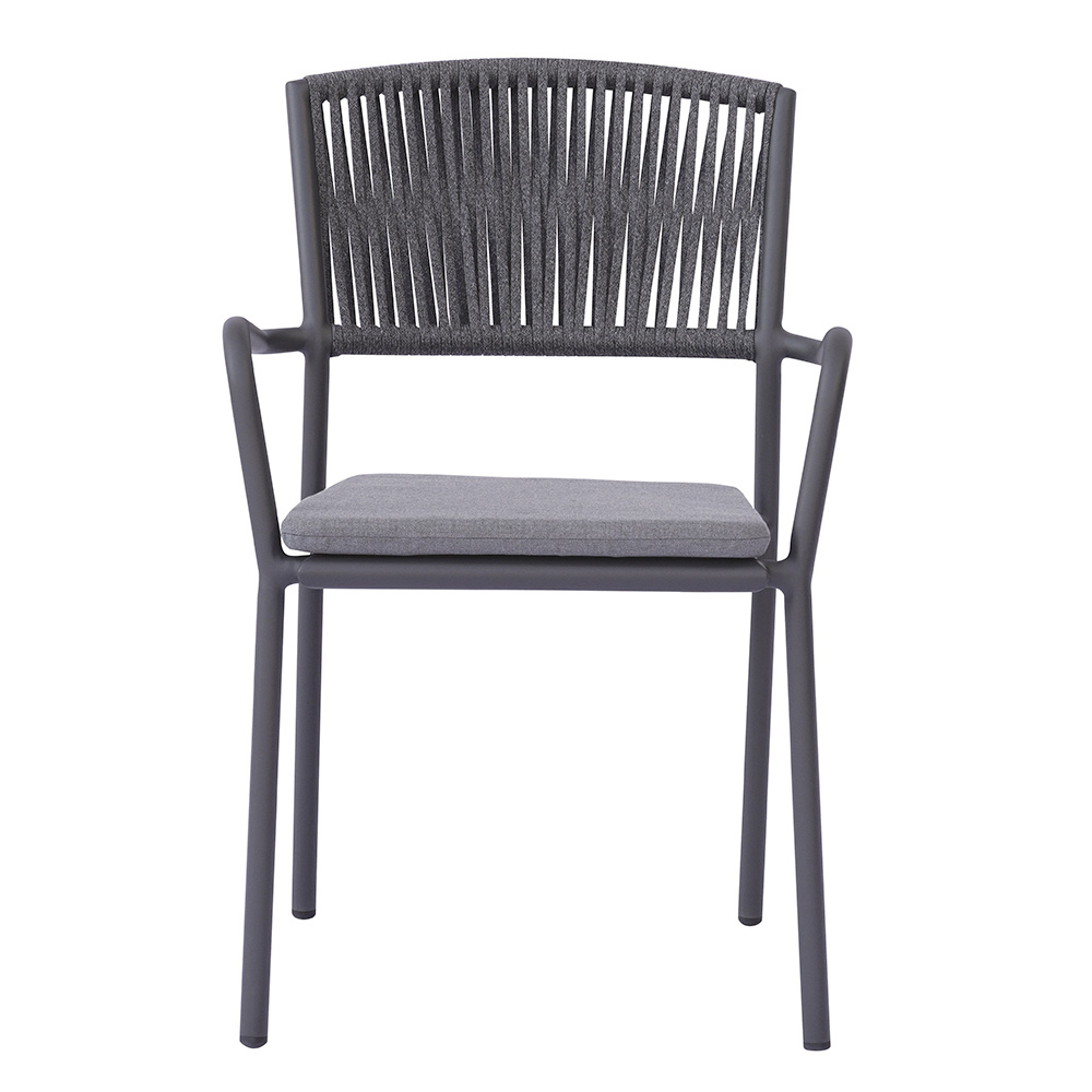 O encosto de corda para uso externo adiciona um toque refinado e contemporâneo, garantindo conforto e respirabilidade, enquanto o assento de alumínio com almofada combinando oferece maciez e conforto, tornando cada momento de relaxamento ainda mais agradável.