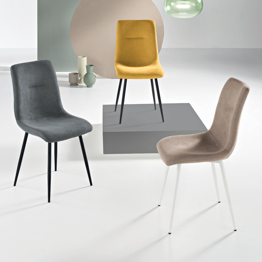 Elegante conjunto de 4 cadeiras modernas, concebidas para decorar com estilo a sua sala de jantar , cozinha ou sala de estar . O assento estofado em tecido com almofada macia garante conforto e uma sensação acolhedora, enquanto a estrutura metálica pintada assegura solidez e durabilidade.