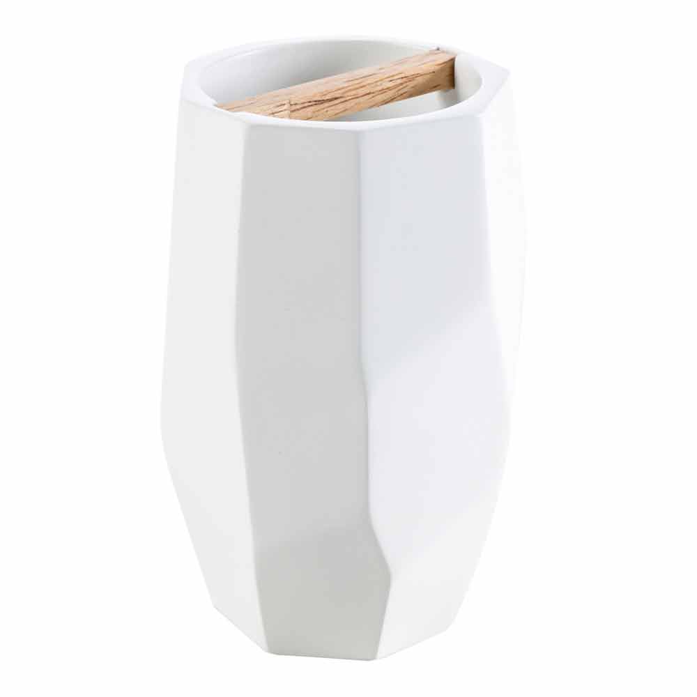 NB: bomba dispensadora em ABS branco, bandeja, cabo da escova, tampa de algodão e separador de vidro em madeira natural.