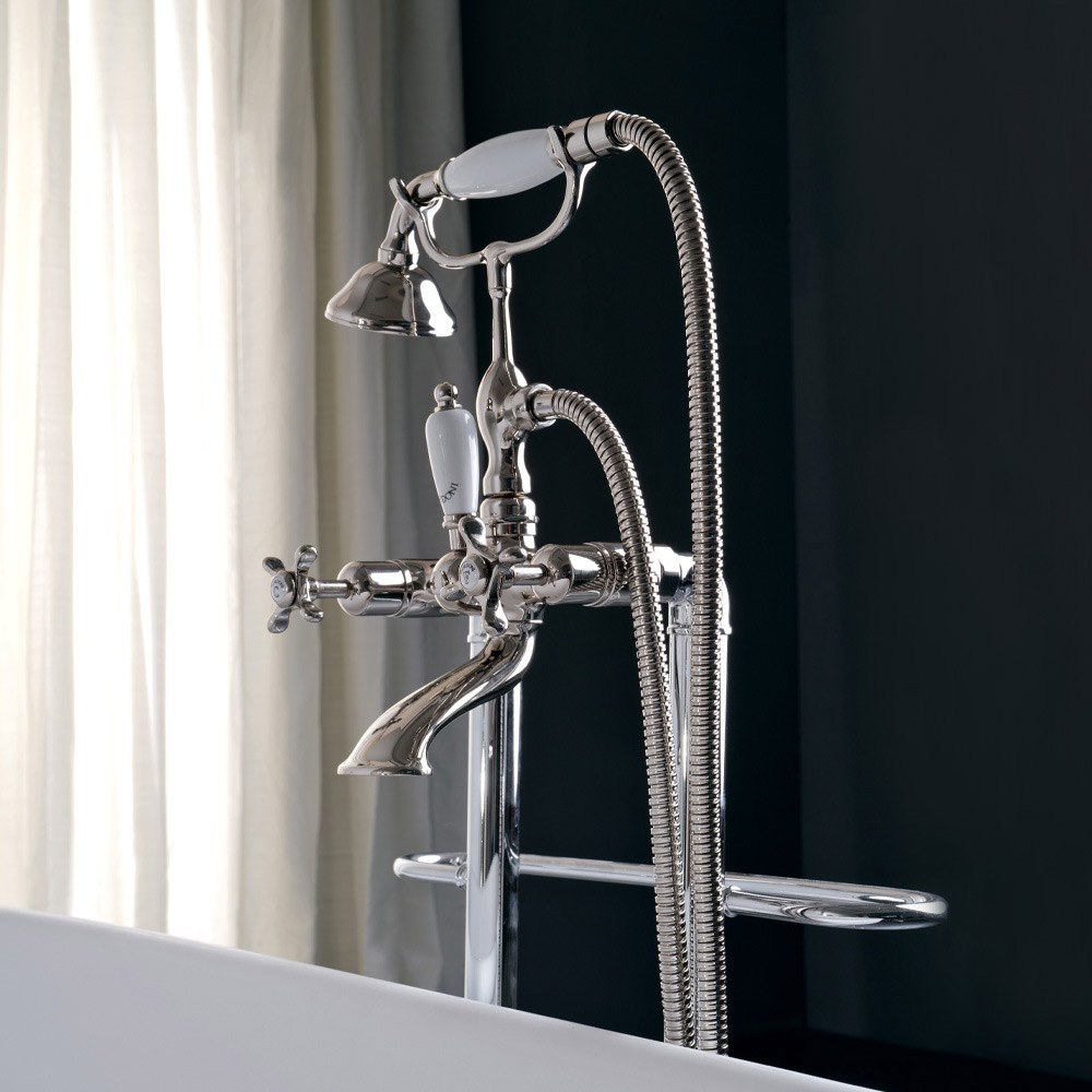 Conjunto de banheira de chãocom porta-toalhas, chuveirostanque e mangueira em latão pesado, fundido em moldes que respeitam os sistemas artesanais do passado e protegido com uma espessa camada de acabamento níquel.