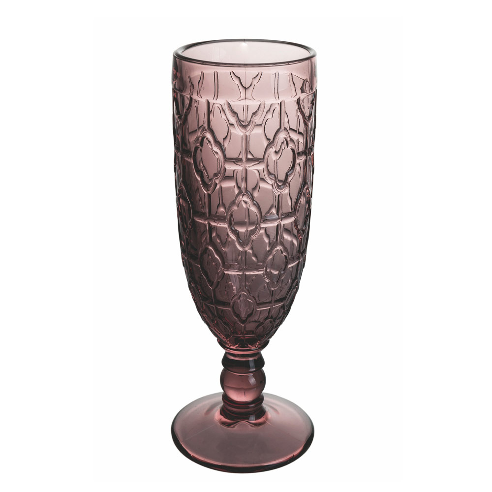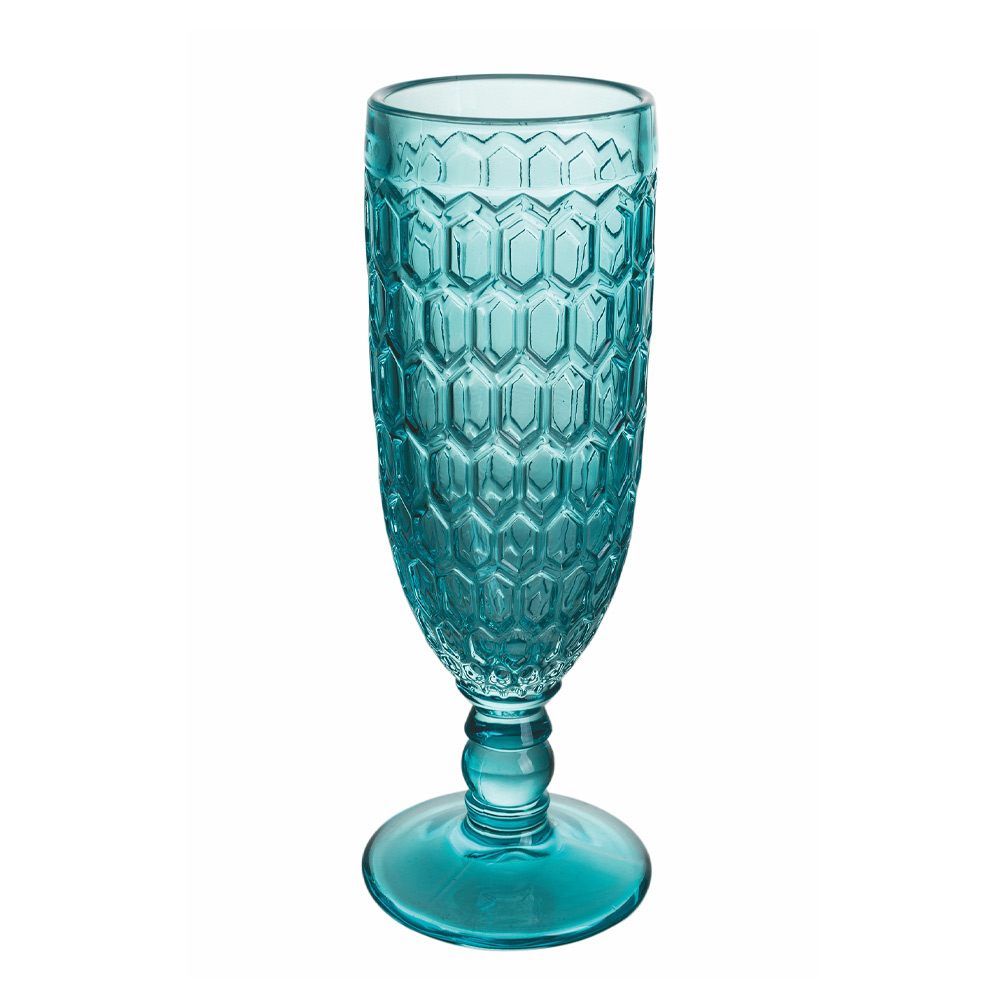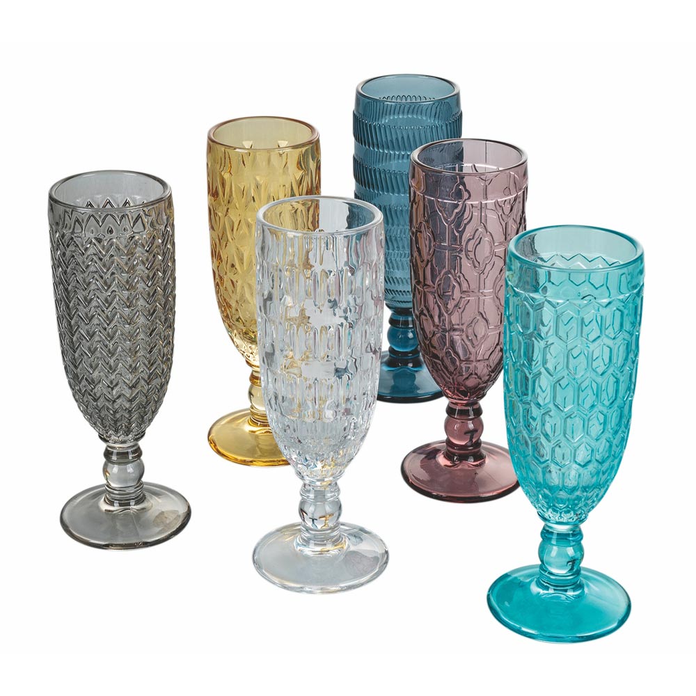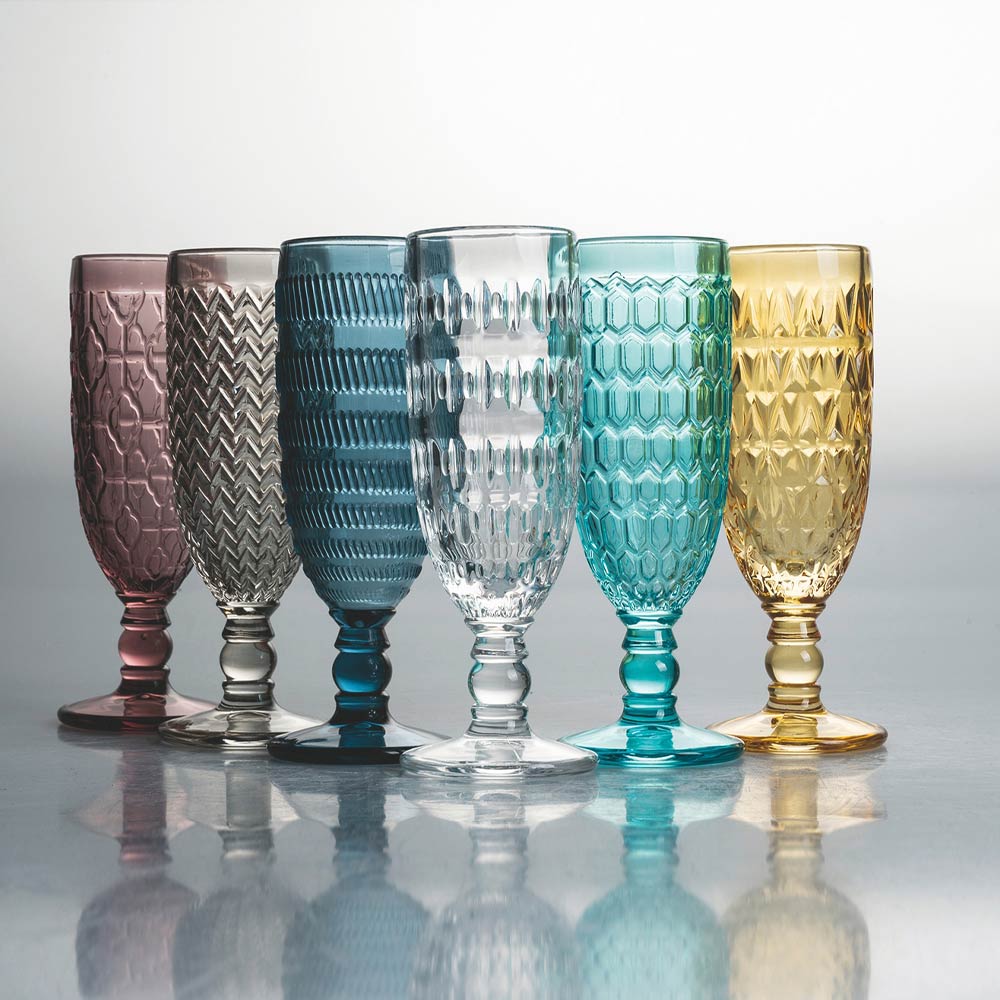 Taças de flauta para vinho em vidro colorido e decoradas em relevo 12 peças.