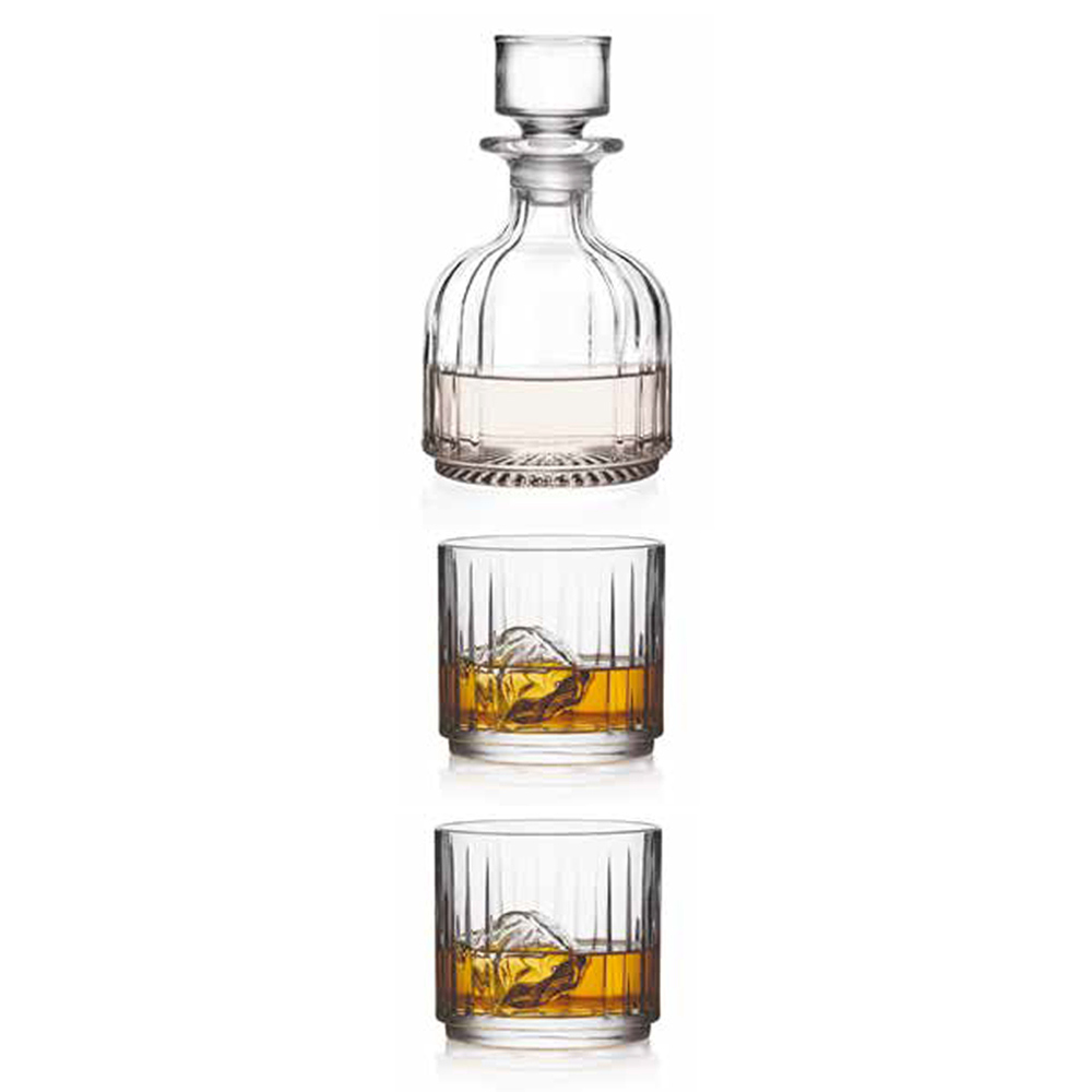 Serviço de garrafa e copos empilháveis para licores em cristal ecológico, 3 peças made in Italy.