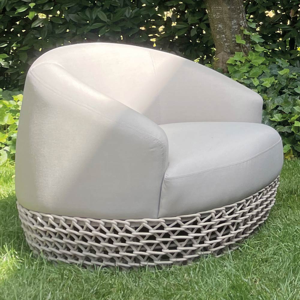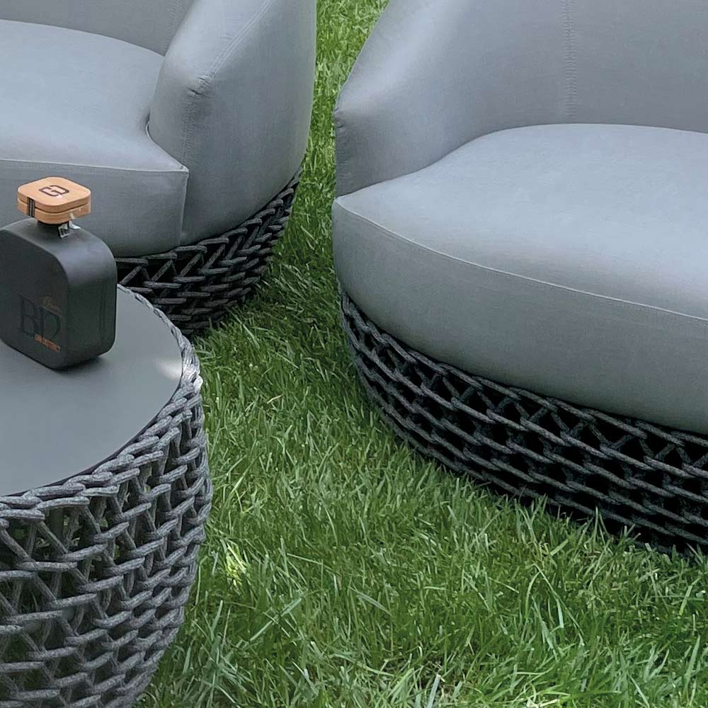 As almofadas, feitas de borracha impermeável para uso externo , garantem o máximo conforto e uma resistência impecável aos agentes atmosféricos, enquanto a estrutura de alumínio escondida no interior dos assentos garante solidez e durabilidade .