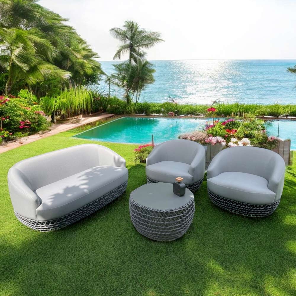 Completado com uma mesa de centro combinando com a mesma trama decorativa, este conjunto de sala de estar é a escolha ideal para criar um oásis elegante de relaxamento , perfeito para jardins, terraços e varandas.