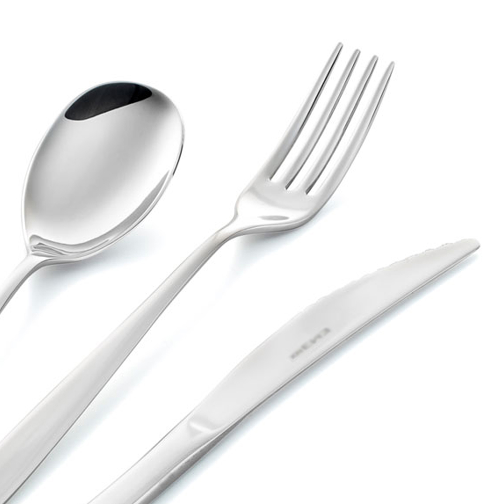 Conjunto completo de talheres de aço inoxidável polido com linhas suaves, 24 peças made in Italy.